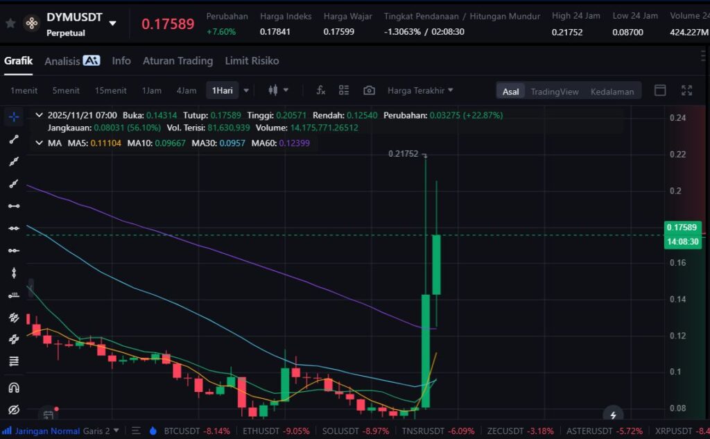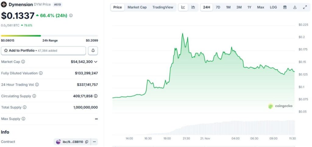 Dymension (DYM) melesat 71.6% dalam 24 jam ke $0.13, dengan volume perdagangan mencapai $341 juta. Proyek ini adalah Layer-1 modular blockchain yang mendukung pembuatan RollApps, blockchain modular yang dapat dikustomisasi dan dihubungkan lewat Inter-Blockchain Communication (IBC).