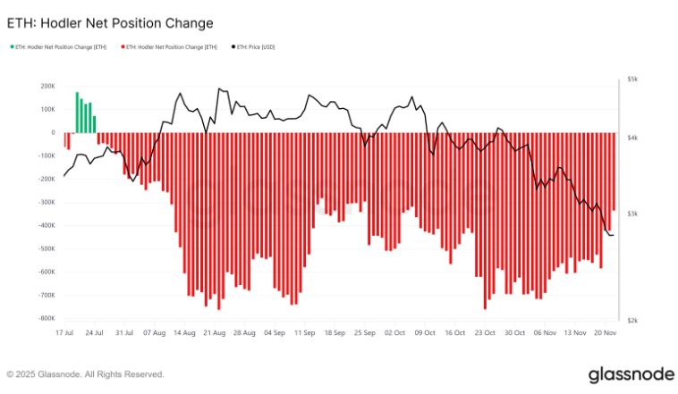 Data on-chain menunjukkan peningkatan pada HODLer Net Position Change, mengindikasikan bahwa pemegang jangka panjang (long-term holders) mulai memperlambat arus keluar ETH dari dompet mereka.
