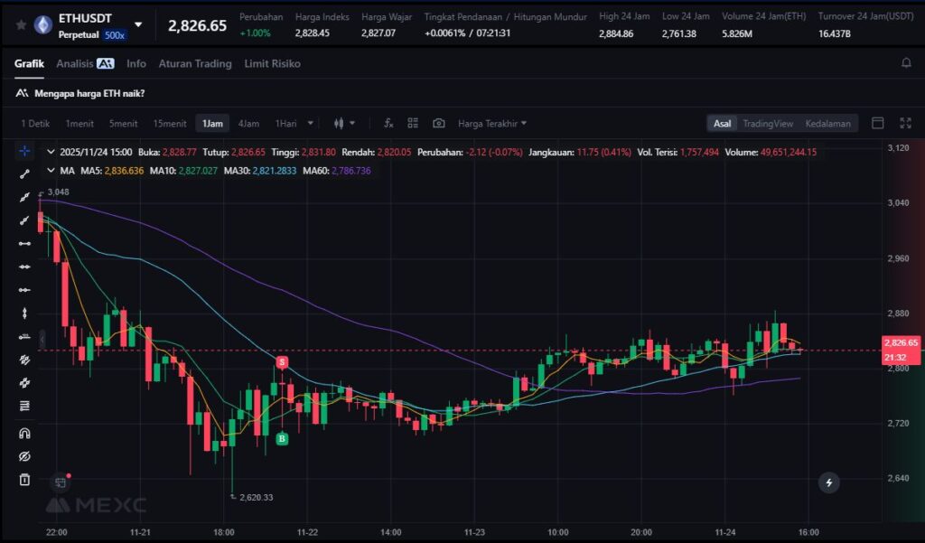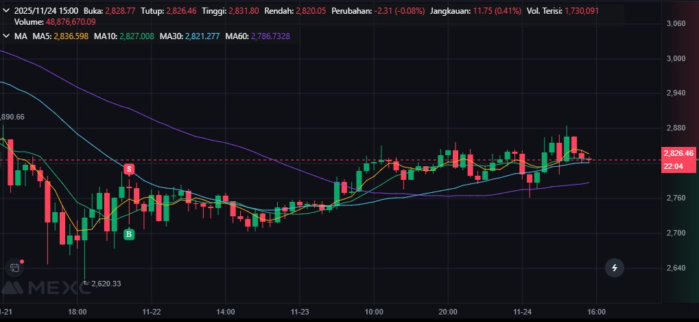 Setelah sempat turun di bawah level kunci, Ethereum (ETH) kini menunjukkan tanda-tanda pemulihan dengan harga menanjak ke sekitar $2.828 di MEXC, naik +1.07% dalam 24 jam terakhir.