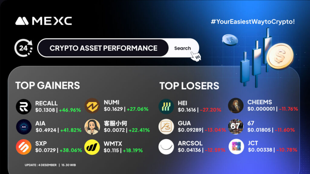Berikut daftar Top Gainers dan Top Losers di MEXC dalam 24 jam terakhir, per 4 Desember 2025 :