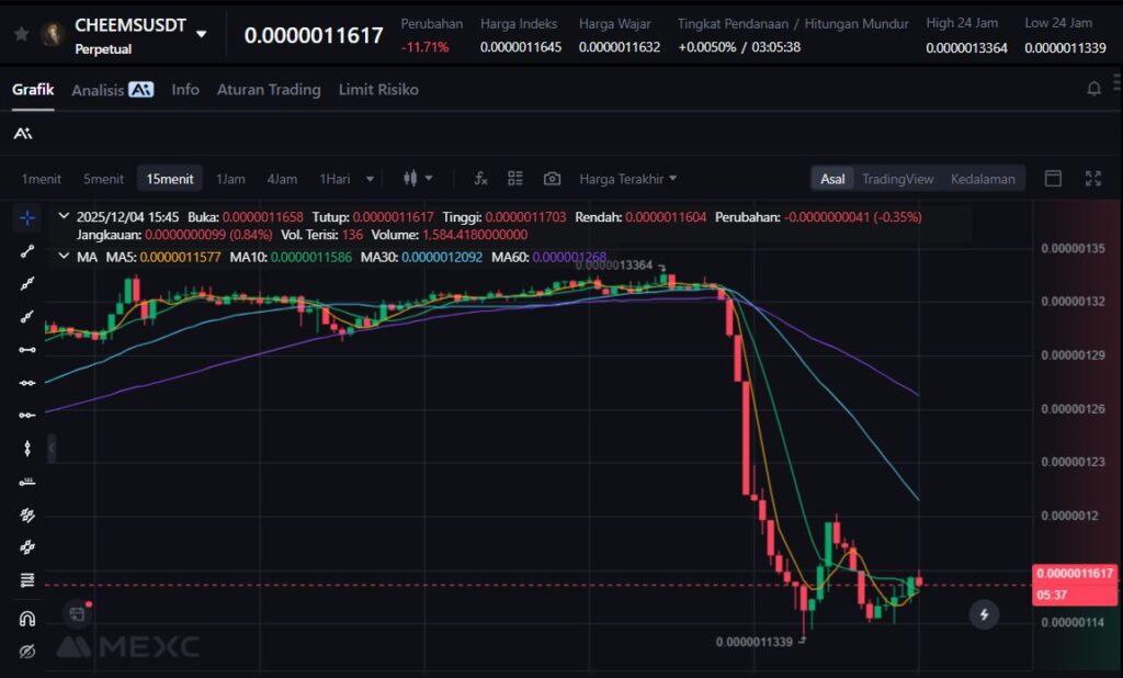 CHEEMS terkoreksi sekitar 11% karena tekanan jual di kalangan trader meme coin. Setelah sempat populer di awal November, minat pasar mulai menurun.