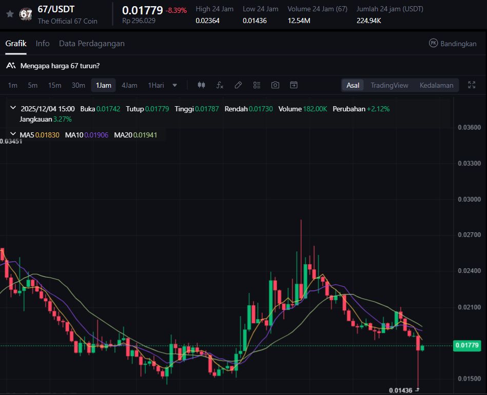 Token 67 kembali melemah lebih dari 11% seiring berkurangnya aktivitas perdagangan di Asia. Setelah sempat masuk daftar gainers minggu lalu, kini investor mulai mengambil posisi aman.