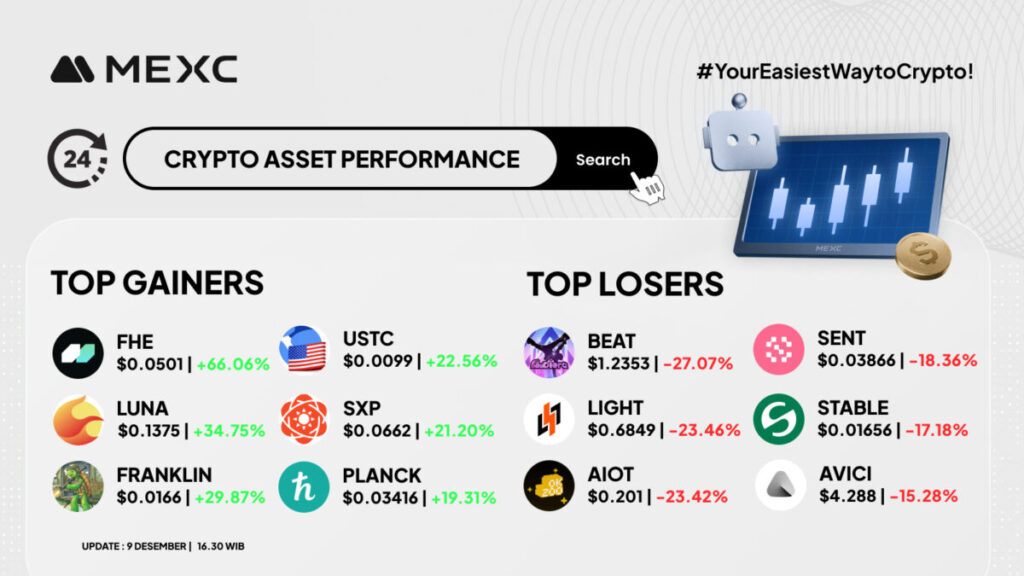 Berdasarkan data MEXC per 9 Desember 2025, pukul 16.30 WIB, berikut daftar aset dengan performa terbaik dan terburuk di market.