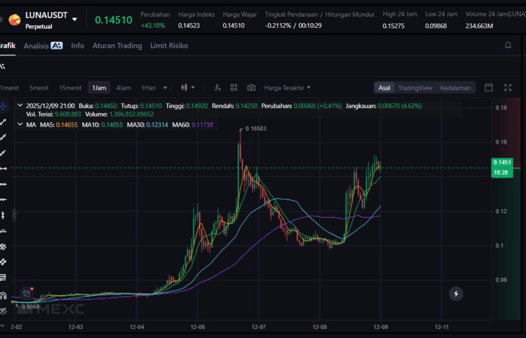 Token LUNA mencatat kenaikan kuat sebesar +34,75% di tengah meningkatnya spekulasi terkait ekosistem Terra 2.0. Pergerakan ini menunjukkan bahwa minat terhadap aset warisan proyek besar masih tetap ada, meski volatilitasnya tinggi.