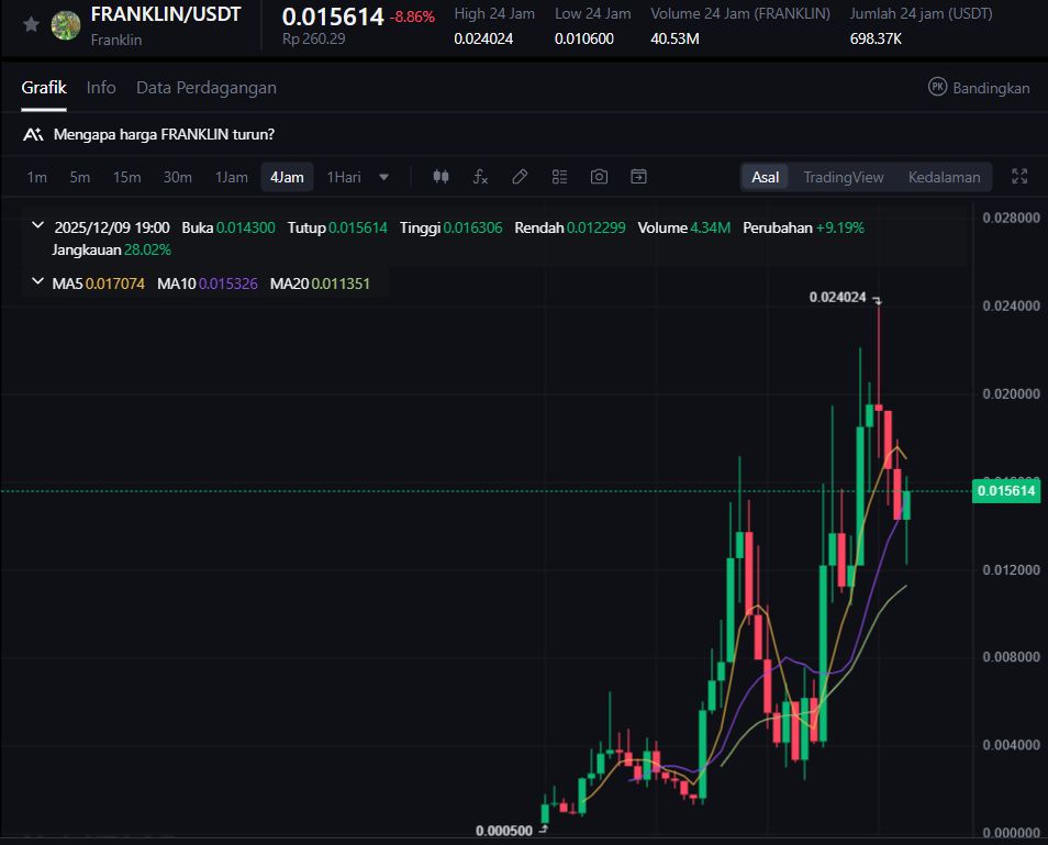 FRANKLIN naik +29,87%, mencerminkan meningkatnya minat pada aset bertema keuangan terdesentralisasi dan tokenisasi aset dunia nyata. Meski tidak termasuk aset berkapitalisasi besar, FRANKLIN menunjukkan potensi karena beririsan dengan sektor keuangan tradisional yang mulai terhubung ke blockchain.