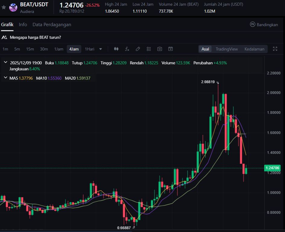 Meski sempat menarik perhatian komunitas musik dan hiburan berbasis blockchain, BEAT masih menghadapi tantangan pada likuiditas dan utilitas tokennya di luar ekosistem awal. Penurunan ini menjadi bagian dari siklus konsolidasi alami setelah kenaikan agresif sebelumnya.