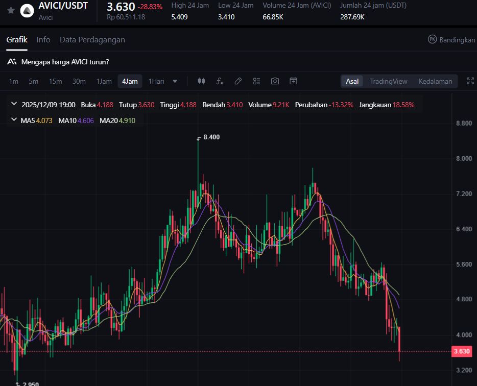 AVICI merupakan aset yang sering diperdagangkan secara spekulatif, dengan pergerakan harga yang cepat dan tidak selalu didukung oleh volume fundamental. Koreksi hari ini kemungkinan besar bagian dari fase konsolidasi setelah reli pendek di awal Desember.