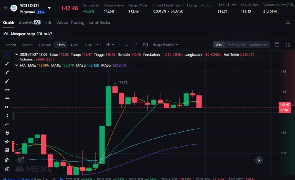 - SOL/USDT di MEXC turun sekitar 2.3% ke kisaran $142,1, sebelum pulih ke $144 pada sesi sore.