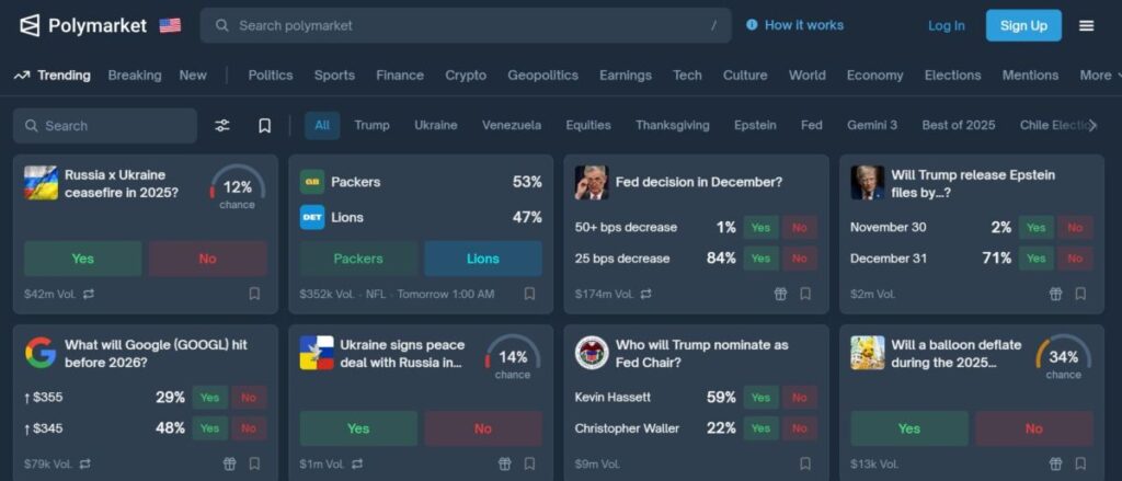 Polymarket menawarkan likuiditas tinggi dan berbagai topik, mulai dari politik, ekonomi, olahraga, hingga hiburan.