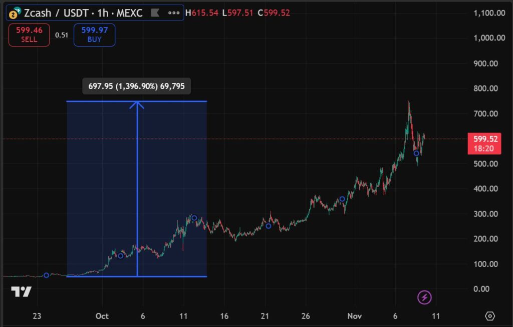 Dalam waktu kurang dari satu bulan, Zcash (ZEC) mencatat reli yang nyaris tak masuk akal. Di MEXC, harganya melonjak dari $49,96 pada 26 September menjadi $747,91 pada 13 Oktober, naik hampir +1.396,9%.