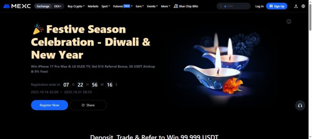 To mark the festive season, MEXC has launched its New Diwali Campaign, giving users a chance to win an iPhone 17 Pro Max, an LG OLED TV, and a 50 USDT airdrop all through simple participation tasks: