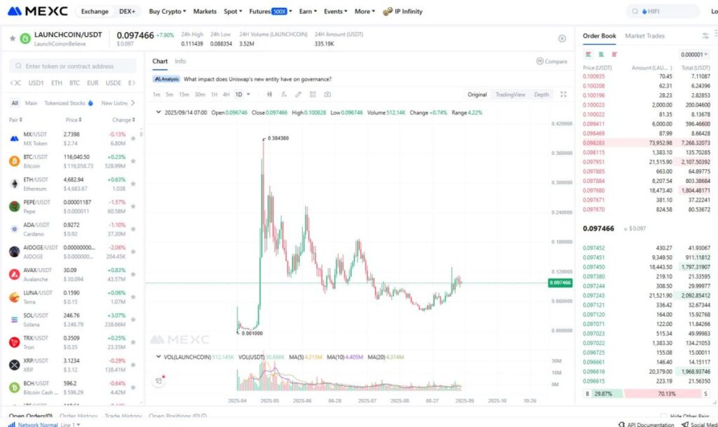 At the time of writing, $LAUNCHCOIN trades at $0.097, with an ATH market cap surpassing $360M.