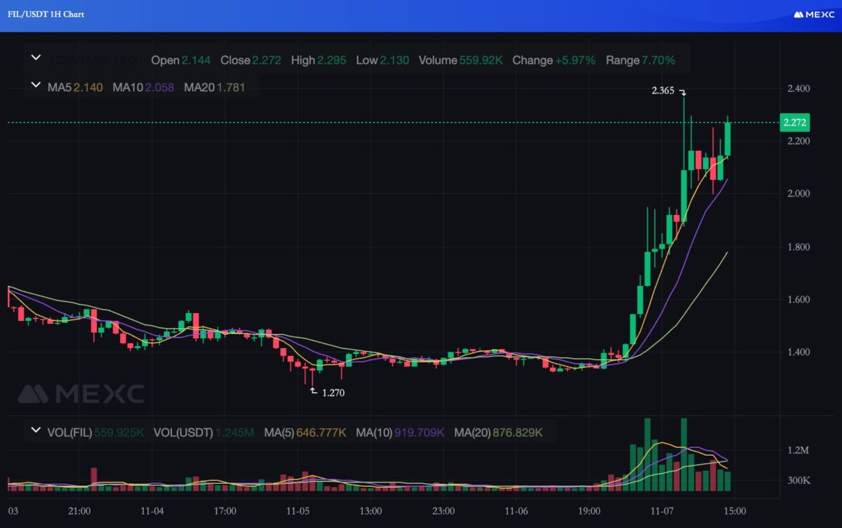 In the fast-moving crypto market, Filecoin’s native token FIL just made a strong comeback. On November 7, 2025, while the global market was volatile, FIL went up against the trend. According to data from the MEXC exchange, FIL rose 45.10% in the past seven days and 53.56% in the last 24 hours. The price stayed around $2.116. This rebound lifted FIL’s market cap back to about $1.5 billion and put it back in the spotlight for decentralized storage.