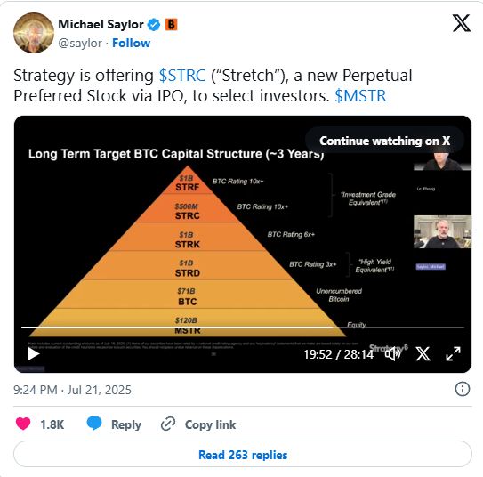 Returning to the pyramid chart Saylor presented, it reflects how the company operates. The base consists of MSTR stock which serves as the foundation for raising capital. The middle layer is Bitcoin which is accumulated using raised funds. The top layer consists of financial instruments such as convertible bonds, preferred shares, and annual dividends of 9 to 10 percent used to reward investors.
