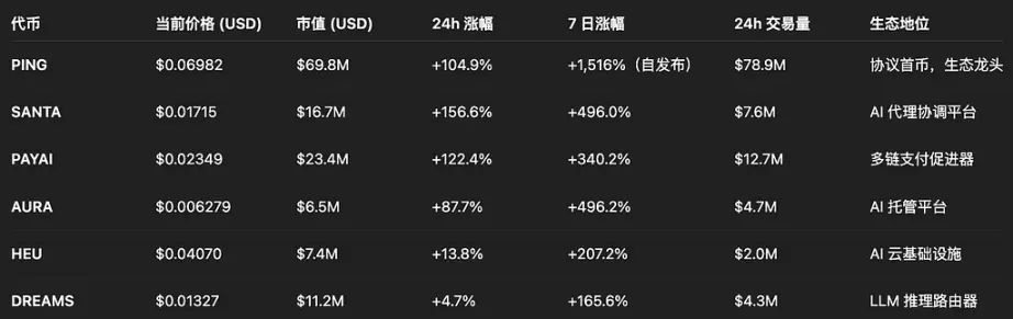 PING emerged as the clear winner in the initial x402 surge. Within 24 hours, it attracted 31,000 new buyers and surged 802%, pushing its market cap above $32 million. Daily trading volume hit $3.5 million, indicating strong liquidity and sustained interest beyond just a single spike.